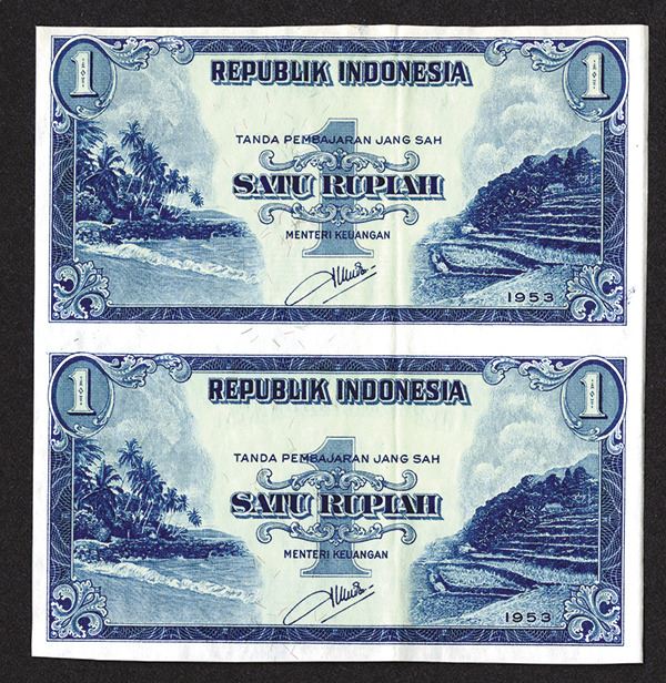 Indonesia. 1 Rupiah. P-40. Beach with palms at left, terraced fields at right. Without serial #s. Uncut vertical pair. Security BNC. Vertical fold. Scarce pressroom production item. Nearly Extremely Fine.