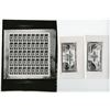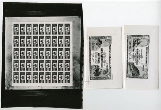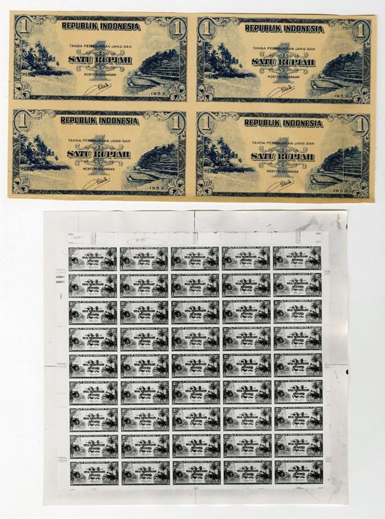 Indonesia. Lot of 5 Intaglio or photo proofs of various 1951 and 1953 banknotes produced by Security Banknote Company for Indonesia. The lot includes an intaglio printed block of 4 notes on beige paper of the issued 1953 notes by SBNC. Also includes are 2 different obverse photo proofs of the 1951 issues in the correct banknote size on photo paper with the final designs. Also included are 2 large photos of uncut sheets of obverse and reverse images of the 1951 2 1/2 Rupiah series in sheets of 54 note. All are in AU to Uncirculated condition. Each note in the uncut proof sheet of the 4, 1 Rupiah notes is in AU condition due to a single vertical fold down each note keeping them from Uncirculated. SBNC. (5)