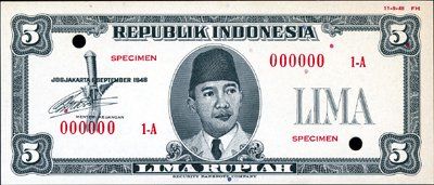 Jakarta. Indonesia. 1948. P-Unlisted. 5 Rupiah Essay specimen banknote of a Security BNC proposed and never issued 1948 Indonesia banknote Series. Note is dated September 1, 1948; Series 1-A. Red specimen overprint, POC and "00000" serial numbers. Small red printing on upper right margin reads " 11-9-48 FH". Front is black, back is olive green. Back of note has farmer plowing with oxen. Evidently Indonesia did not accept this issue. Choice Unc. condition. Rare. SBNC.