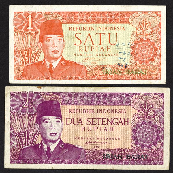 Indonesia. Irian Barat. 1, 2-1/2 Rupiah. P-R1, R2. President Sukarno at left. Both Very Good, first with graffiti, second with stains.