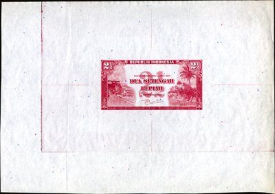 Indonesia. 1950-51 (1951 Issue). P-39 Unlisted. 2 1/2 Rupiah 4 different P-39 proof and specimen banknote faces or backs from the 1951 issue. 1). Uniface specimen face with red "000000" serial numbers, POC and specimen overprint. One light vertical fold in middle, AU condition. Unique in archive; 2). Trial Color LDP of face in red instead of issued color, orange, without undertint, printed on 12 by 9 inch banknote paper. Choice Unc.; 3). Unique LDP Trial Color of back in red instead of issued color green. Printed on white paper and dated "12/15/50". Choice Unc. condition; 4). Unique LDP of eagle vignette used on back of back note. Choice Unc. condition. Rare group. SBNC.