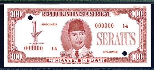 Indonesia, 1949, 100 Rupiah, P-Unlisted100a, Specimen banknote, Essay specimen banknote of a Security BNC proposed and never issued 1949 Indonesia banknote Series. Note is dated December 21, 1949, Block 1-A, S/N 000000, Red specimen overprints, POC's. Small red printing on upper right margin of face reads “12-21-49 FM” and back “12-21-49 BM”. Front is maroon, back is maroon. Face with portrait of Sukarno, Back with farmer plowing with oxen. Evidently Indonesia did not accept this issue. PMG graded Gem Uncirculated 66 EPQ. Rare essay note. SBNC.