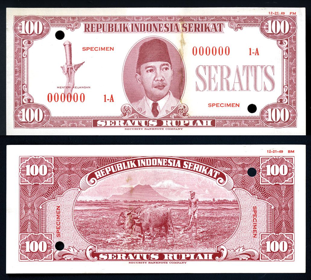 Indonesia, 1949, 100 Rupiah, P-Unlisted100a, Essay specimen banknote of a Security BNC proposed and never issued 1949 Indonesia banknote Series. Note is dated December 21, 1949, Block 1-A, S/N 000000, Red specimen overprints, POC's. Small red printing on upper right margin of face reads "12-21-49 FM" and back "12-21-49 BM". Front is maroon, back is maroon. Face with portrait of Sukarno, Back with farmer plowing with oxen. Evidently Indonesia did not accept this issue. Uncirculated with a 2 inch stain to the right of Sukarno's portrait and very light toning on the upper left corner. Rare essay note. SBNC.