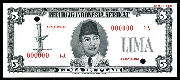 Indonesia, ND, (ca.1949). Series 1-A. P-UNL5as, P-Unlisted, 5 Rupiah. Essay specimen banknote of a Security BNC proposed and never issued 1949 Indonesia banknote Series. Red specimen overprints, POC's and "00000" serial numbers. Front is black, back is olive green. Back of note has farmer plowing with oxen. Evidently Indonesia did not accept this issue. The face is PMG graded Superb Gem Uncirculated 67 EPQ and the back Gem Unc. 66 EPQ. Rare essay note and possibly the finest known. SBNC.