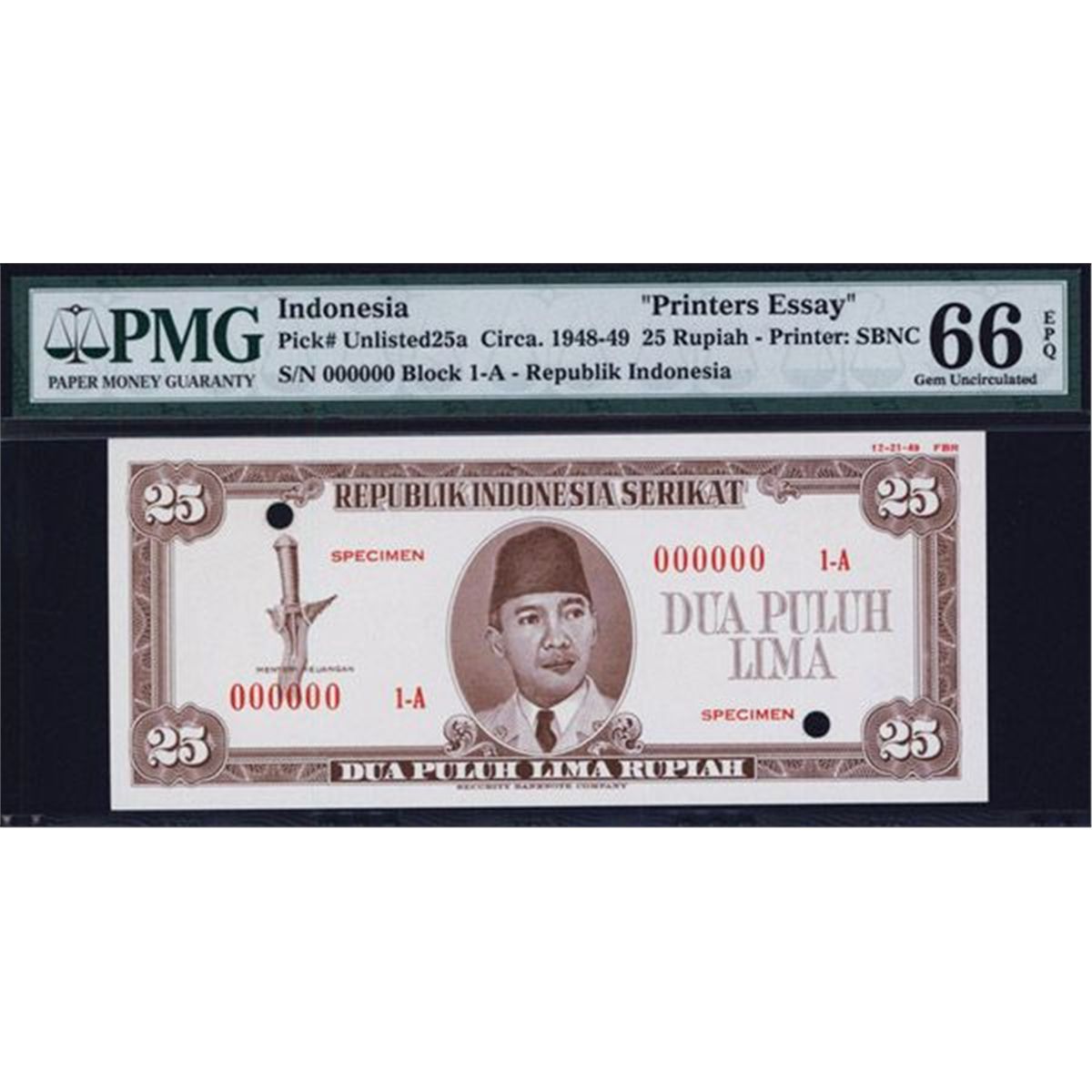 Indonesia, ND, (ca.1949), 25 Rupiah, Block 1-A. P-Unlisted, Essay specimen banknote of a Security BNC proposed and never issued 1948 Indonesia banknote Series. Red specimen overprints, POC's and “00000” serial numbers. Small red printing on upper right margin of face reads “ 12-21-49 FBR and back “12-21-49 BBR. Front is Brown with Sukarno in middle, back is Brown with farmer plowing with oxen. PMG graded Gem Uncirculated 66 EPQ (Exceptional Paper quality), Evidently Indonesia did not accept this issue. Rare essay note. SBNC.