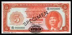 1950. 5 Rupiah. P-36 Unlisted Specimen banknote. Orange face and back, Sukarno on right. Black specimen overprint, "00000" serial numbers and oval TDLR Specimen on bottom middle, "Specimen No.38" on bottom left corner. XF+ to AU. Rare TDLR specimen banknote.