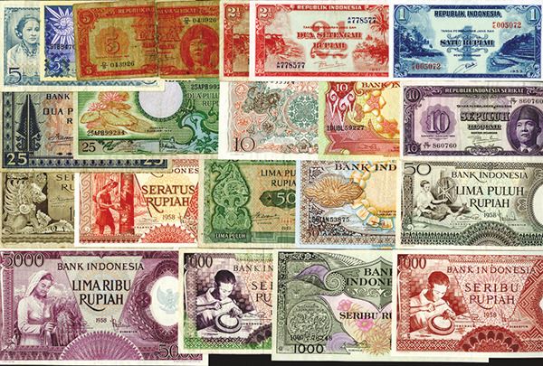 Indonesia. 1, 2-1/2, 5, 10, 25, 50, 100, 1000, 5000 Rupiah. P-36; 37; 39; 40; 41; 42; 43; 44; 45; 46; 58; 59; 61; 62; 64; 65; 66; 67; 68; 71b. One is Good and split; 9 are Fine to VF; others are EF to Choice Uncirculated.