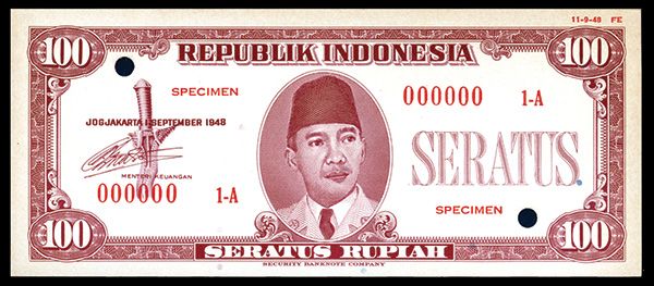 Indonesia, P-Unlisted, 1948, 100 Rupiah. Essay specimen banknote of a Security BNC proposed and never issued 1948 Indonesia banknote Series. Note is dated September 1, 1948; Series 1-A. Front is maroon, back is maroon. Back of note has farmer plowing with oxen. Evidently Indonesia did not accept this issue. PMG graded Choice Uncirculated 64. Rare essay note. SBNC.