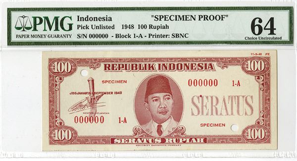 Indonesia, P-Unlisted, 1948, 100 Rupiah. Essay specimen banknote of a Security BNC proposed and never issued 1948 Indonesia banknote Series. Note is dated September 1, 1948; Series 1-A. Front is maroon, back is maroon. Back of note has farmer plowing with oxen. Evidently Indonesia did not accept this issue. PMG graded Choice Uncirculated 64. Rare essay note. SBNC.