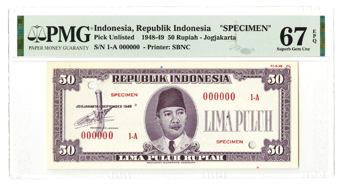 Indonesia, 1948, 50 Rupiah, P-Unlisted, Essay specimen banknote of a Security BNC proposed and never issued 1948 Indonesia banknote Series. Note is dated September 1, 1948; Series 1-A. Red specimen overprints, POC's and "00000" serial numbers. Front is purple, back is indigo. Back of note has farmer plowing with oxen. PMG graded Superb Gem Uncirculated 67 EPQ. Tied for finest known with one other note out of 3 graded, Rare essay note. SBNC.(Cert # 8072412-030). SBNC.