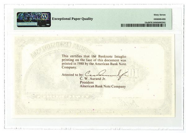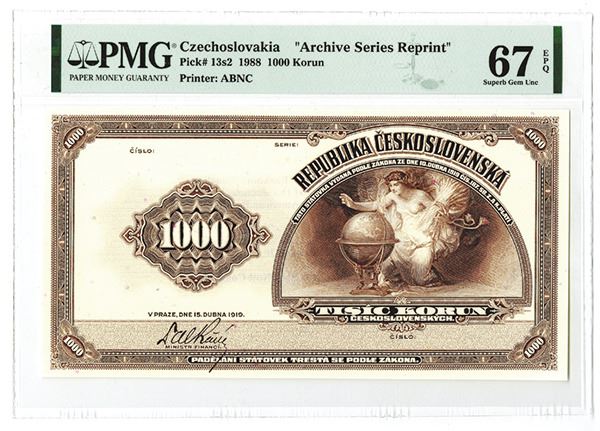 Czechoslovakia, 1000 Korun, P-13s2, Reprint Proof, Brown with no underprint, back with attestation by ABNC. PMG graded Superb Gem Uncirculated 67 EPQ. ABNC.