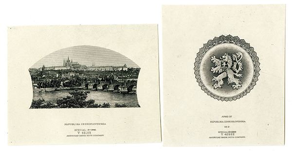 Czechoslovakia. Lot of 2 proofs used on 1920, 100 Korun, P-17. Includes Czechoslovakia Arms used on the face of the note and Hradcany and Charles bridge across Vitava River in middle. Both printed in black on india paper that is unmounted, Both with plate numbers and description. Both are in CU to Gem Uncirculated condition, Rare proof vignettes. ABNC. (2)