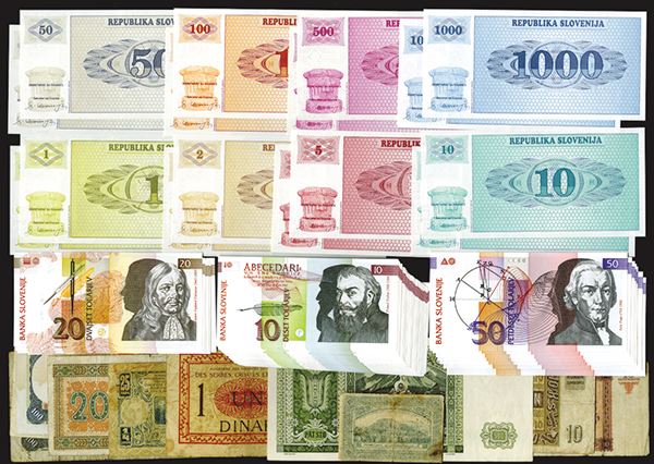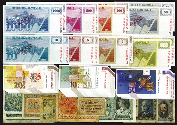Slovenia.1, 2, 5, 10, 50, 100, 500, 100 Tolar. VZOREC Specimens. P-1s1, 2s1, 3s1, 4s1, 5s1, 6s1, 8s1, 9s1. 2 of each. Uncirculated; Banka Slovenije. 10, 20, 50 Tolarjev. P-11a (42), 12a (6), 13a (7). All Crisp Uncirculated. Plus 6 other modern Slovenia in low grades. Slovakia. 7 in low grade. Finally three 1919-1920s issues in low grade, one a town issue from Ljubljana.