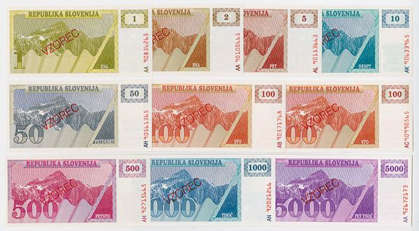 Slovenia. Includes 1, 2, 5, 10, 50, 100, 500, 1000, and 5000 Tolarjev. All overprinted VZOREC. P-1s1; P-2s1; P-3s1; P-4s1; P-5s1; P-6s1 (2); P-8s1; P-9s1; and P-10s1. All Choice to Gem Unc. (10)