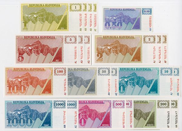 Slovenia. Includes 0.50 Tolar, 1990, P-1A; 1 Tolar, 1990, P-1 (4); 2 Tolarjev, 1990, P-2 (3); 5 Tolarjev, 1990, P-3 (3); 10 Tolarjev, 1990, P-4 (2); 50Tolarjev, 1990, P-5 (2); 100 Tolarjev, 1990, P-6; 200 Tolarjev, 1990, P-7 (2); 500 Tolarjev, 1990 & 1992, P-8a & P-8b (2); and 1000 Tolarjev, 1991 & 1992, P-9a & P-9b (2). All Choice to Gem Unc. (22)