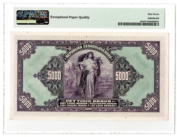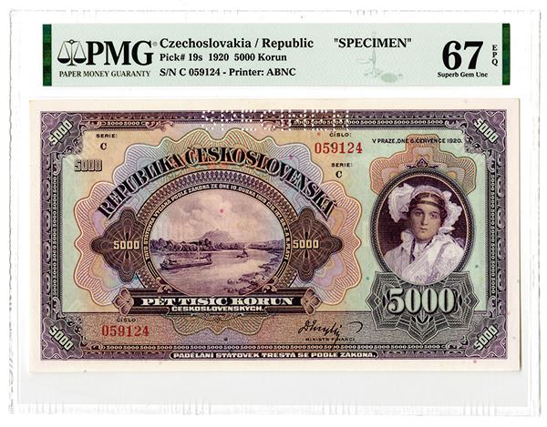 Czechoslovakia. Specimen 5000 Korun, 1920, P-19s. PMG graded Superb Gem Unc 67 EPQ (Cert # 1956589-033). ABNC. Only one other example offered at auction at this grade level since 2012, none higher.