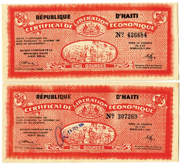 Haiti. Lot of 2 notes, Both are 5 Gourdes, P-502a, Issued Banknotes, Red with arms of Haiti and workers below, Unlisted without series, Both in XF to AU condition, one with a small pin hole. (2)