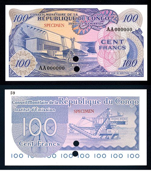 Congo, ND (1963), 100 Francs, P-1ct., Specimen Color Trial, Blue on m/c instead of issued green and m/c, Specimen overprints, POC's, Choice to Gem Uncirculated, Attractive high grade example.