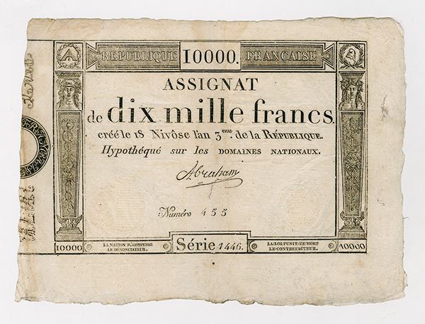 France. 1795, Assignat de Dix Mille Grancs, 10,000 Francs, No. 455 sign. Abraham, P-A82, VF with 2 small holes on right margin from storage otherwise very attractive note. (Ex. John E. Herzog Collection)