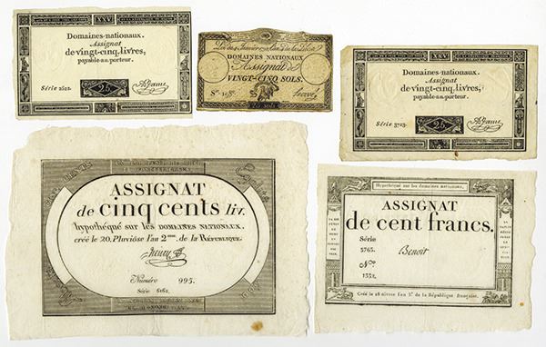 France. Lot of 5 notes, includes 500 Livres, P-A77, XF to AU condition; 100 Francs, P-A78, XF condition; 1792 "First" Issue, 25 Sols, P-A55, XF-AU; 1793 Issue, 25 Livres, P-A71, (2 examples).