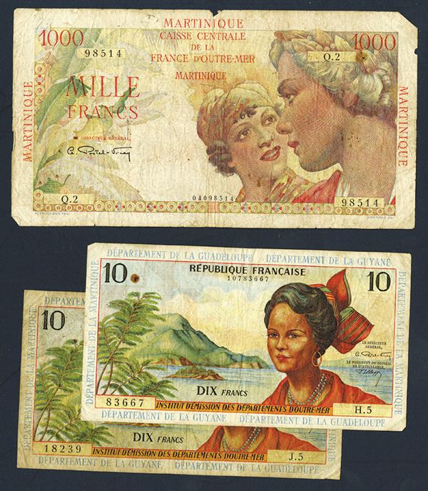 French Antilles. 10 Francs. SCWPM 8b (2). Signature 2.; Martinique. 1000 Francs. SCWPM 33. All colorful, but Good - Very Good, the last with some paper loss. 3 pieces.