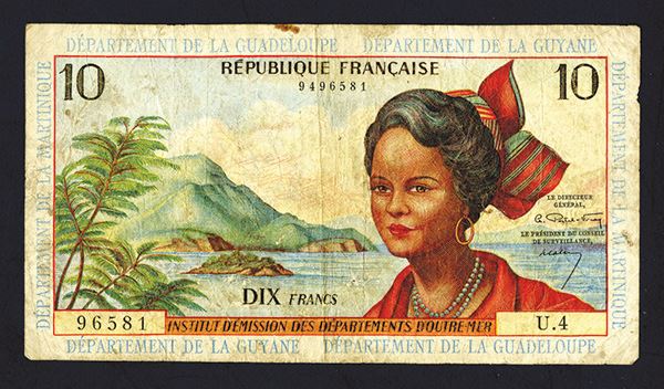 French Antilles. Institut d'Emission des Departements d'Outre-Mer. 10 Francs. ND (1964) SCWPM 8. Very Good, a bit dirty.