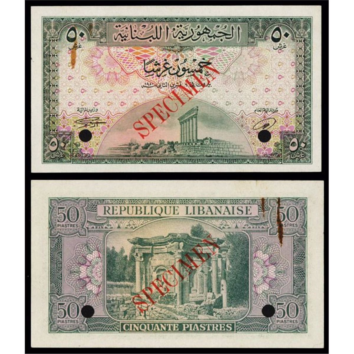 Lebanon, ND (ca. 1948-1950), 50 Piastres, P-43 Unlisted Specimen, Green on m/c instead, Columns of Baalbek at center, back green on m/c, No S/N, SPECIMEN overprint in red, POC, Note appears in Uncirculated condition but there is paper clip rust on the top left that is more visible on the back. Rare note in any form and condition.