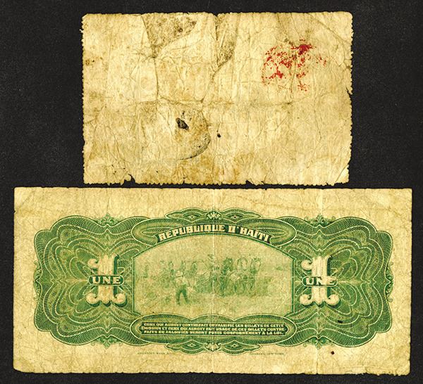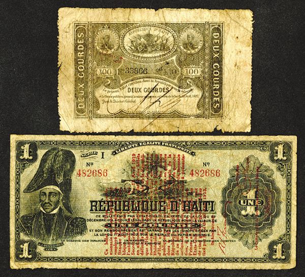 Haiti. 2 Gourdes. P-42 Fine; 1 Gourde, P-140a. Fine. J.J. Dessalines at left end. 2 pieces.