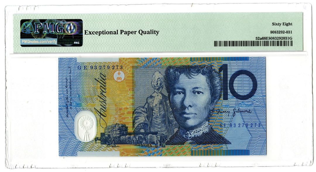 Australia. 1993. $10, P-52a, R316a-b, issued banknote, polymer, signatures Fraser-Evans, Blue on m/c, back blue and m/c, S/N GE93279273, PMG Graded Superb Gem Unc 68 EPQ. This is the highest graded note out of 104 graded and listed in the PMG Census. It will be literally impossible to improve upon.