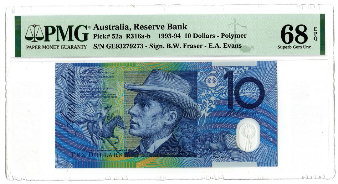 Australia. 1993. $10, P-52a, R316a-b, issued banknote, polymer, signatures Fraser-Evans, Blue on m/c, back blue and m/c, S/N GE93279273, PMG Graded Superb Gem Unc 68 EPQ. This is the highest graded note out of 104 graded and listed in the PMG Census. It will be literally impossible to improve upon.