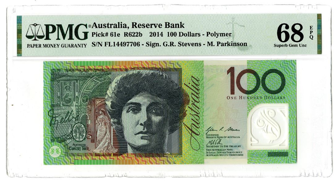 Australia. 2014. $100, P-61e, R622b, issued banknote, polymer, signatures Stevens-Parkinson, S/N FL14497706, PMG Graded Superb Gem Unc 68 EPQ. Tied with 8 others as highest graded out of 105 listed in the PMG census.
