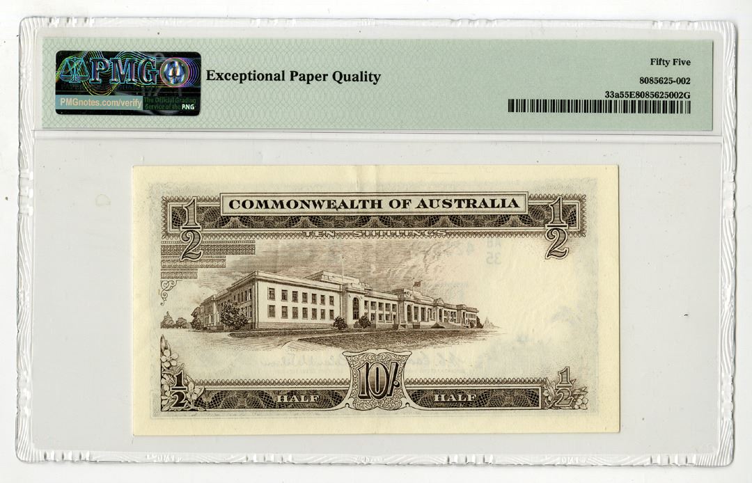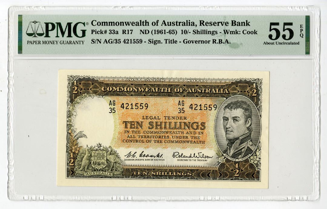 Australia, ND (1961-65). 10 Shillings, P-33a, Issued Banknote, Dark brown on orange and green underprint, Arms at lower left, Portrait of Matthew Flinders at right, S/N AG/35 421559, PMG graded About Uncirculated 55 EPQ.