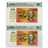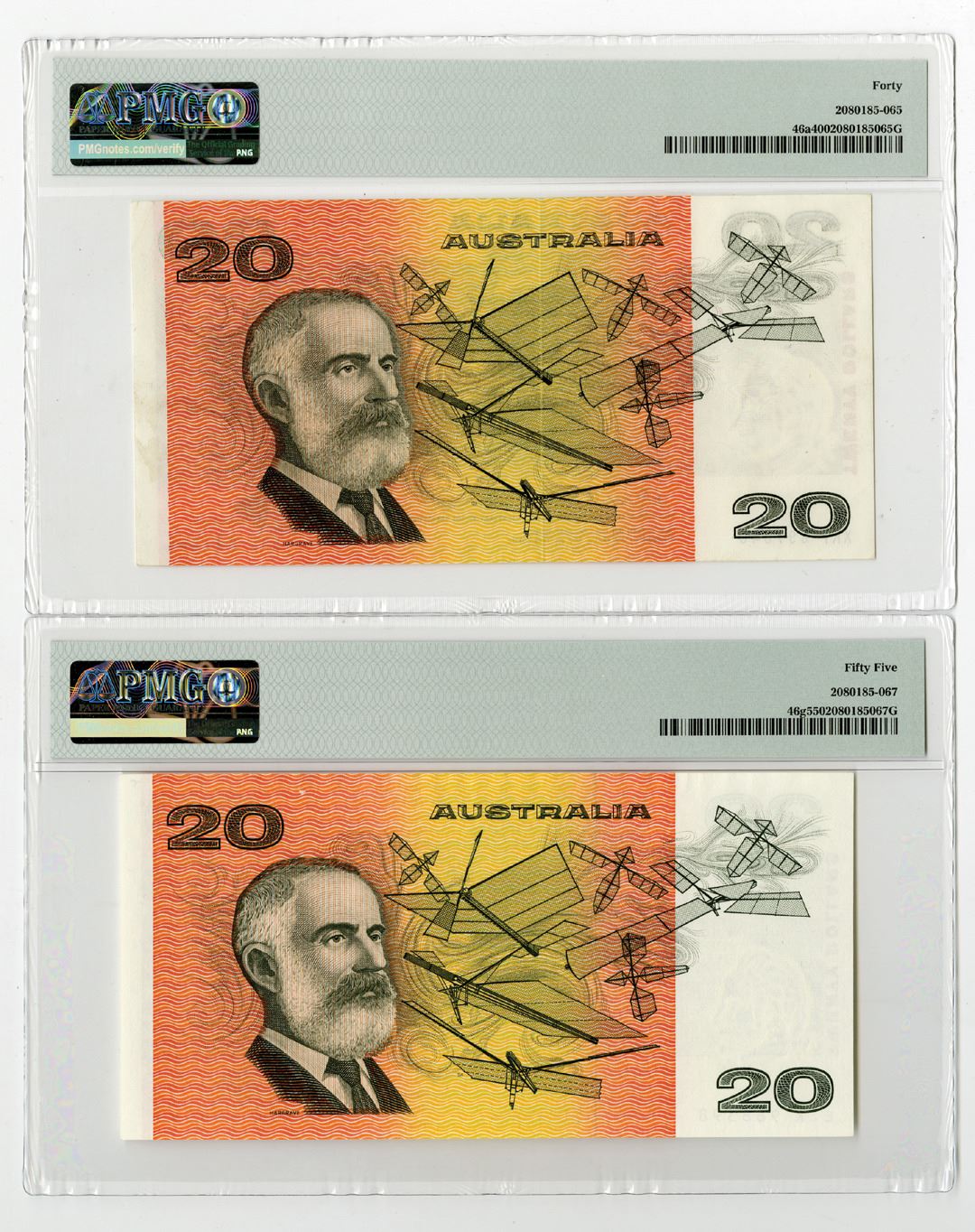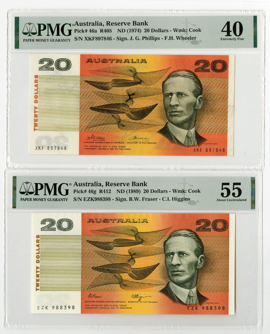 Australia. ND (1974-89). Lot of 2 Issued banknotes: 20 Dollars, P-46a, R405, Multicolor, S/N XKF897846, Sign. J.G. Phillips - F.H. Wheeler, Watermark: Cook, PMG graded Extremely Fine 40; 20 Dollars, P-46g R412, Multicolor, S/N EZK988398, Sign. B.W. Fraser - C.I. Higgins, PMG graded About Uncirculated 55. (2)