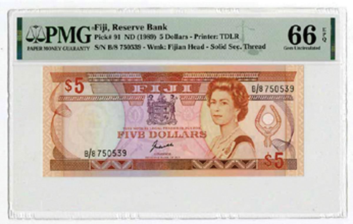 Fiji, ND (1989). $5 Dollars, P-91, Issued banknote, Brown-red on multicolor underprint, S/N B/8 750539, Watermark: Fijian Head, Solid Sec. Thread, PMG graded Gem Uncirculated 66 EPQ. Printer: TDLR.