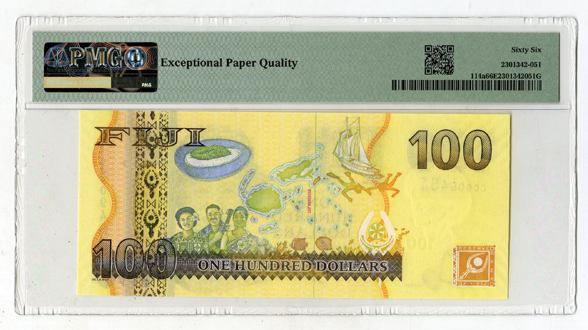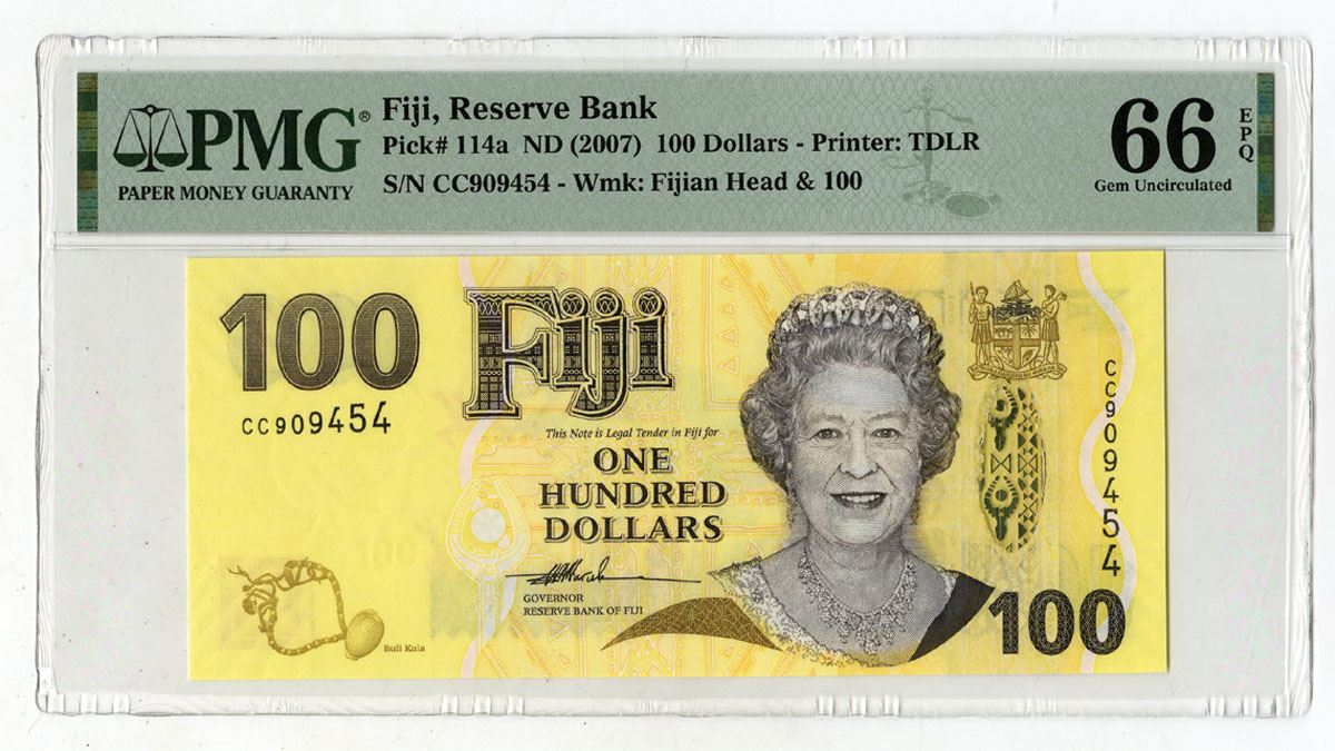 Fiji, ND (2007). $100, P-114a, Issued Banknote, Brown on yellow underprint with portrait of the late Queen Elizabeth II at right, S/N CC909454, PMG graded Gem Uncirculated 66 EPQ. Printer: TDLR.