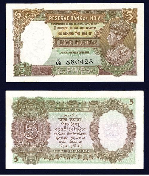 india, ND, 5 Rupees, P-18b, Deshmukh signature, S/N K/89 880428, Uncirculated to CU condition. Large even margins, bright colors and sharp corners enhance this lovely note with the usual staple holes on the left border area.