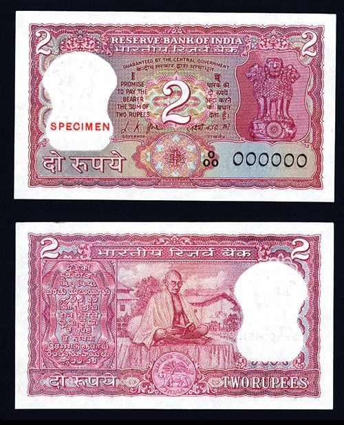 India, (1969-70), 2 Rupees, P-67a, Unlisted Specimen banknote, Red-violet on m/c, Asoka column on right, English text on left, L.K. Jha Signature 76, Red SPECIMEN overprint over Asoka column watermark at left, Black S/N 000000, Choice Uncirculated with claims to Gem with large margins, bright colors and fresh appearance.