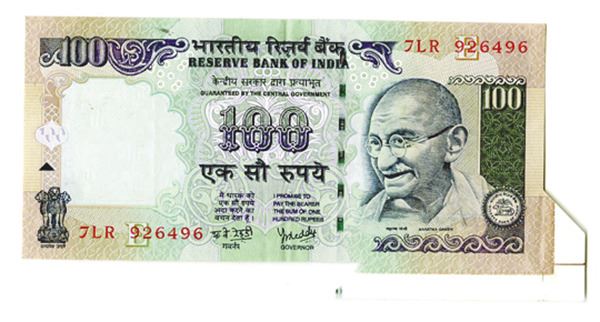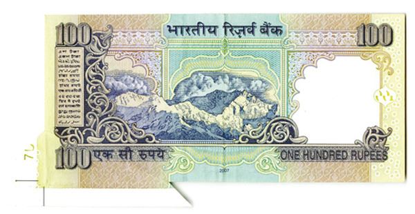India. Issued 100 Rupees, 2007, P-98c, with major cutting/folding error at bottom right, XF.