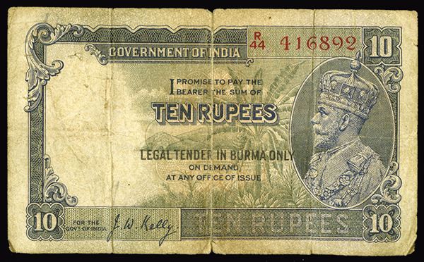 Burma, 10 Rupees, P-2b, (Printed on India P-16), issued banknote, black "Legal Tender in Burma Only" overprint on face and back, King George V on right, S/N R/44 416892, VG to Choice VG, bright colors and large even margins enhance this rare note. A strong vertical middle fold keeps this note from Fine condition, there are 2 small separations at the margins of the vertical folds that do not detract from this note.