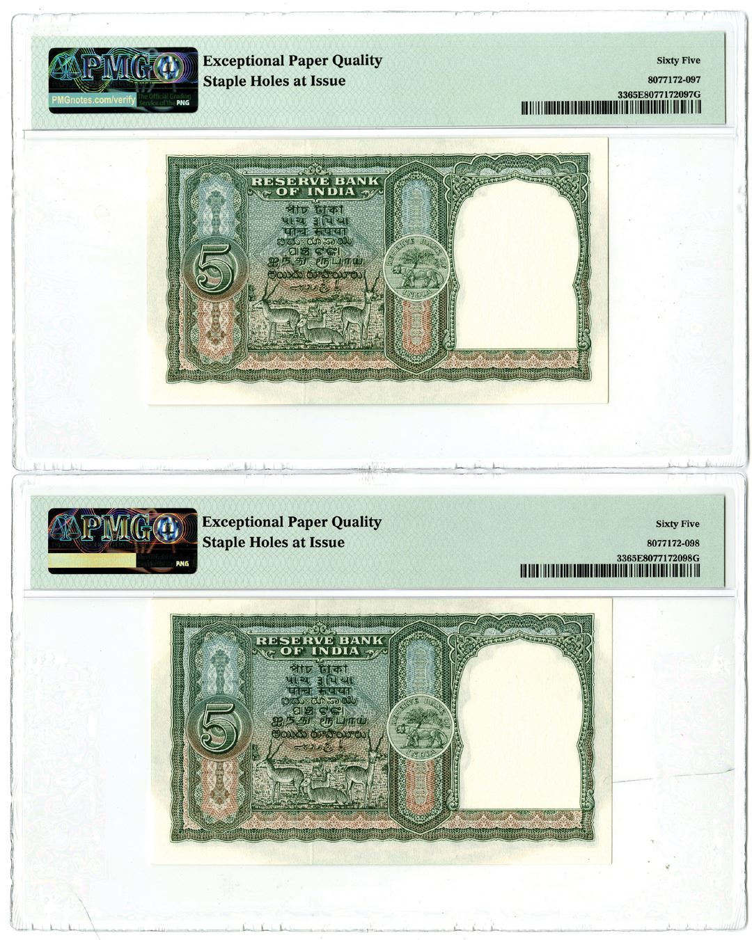 India. ND (1951). Lot of 2 sequential items: Both are 5 Rupees, P-33 Jhun&Rez 6.3.2.1, Sequential pair, Green and multicolor, S/Ns are J/39 006513 and J/39 006514, Sign. #72 - Incorrect Hindi. Both are PMG graded Gem Uncirculated 65 EPQ with comments "Staple Holes as Issued". (2)