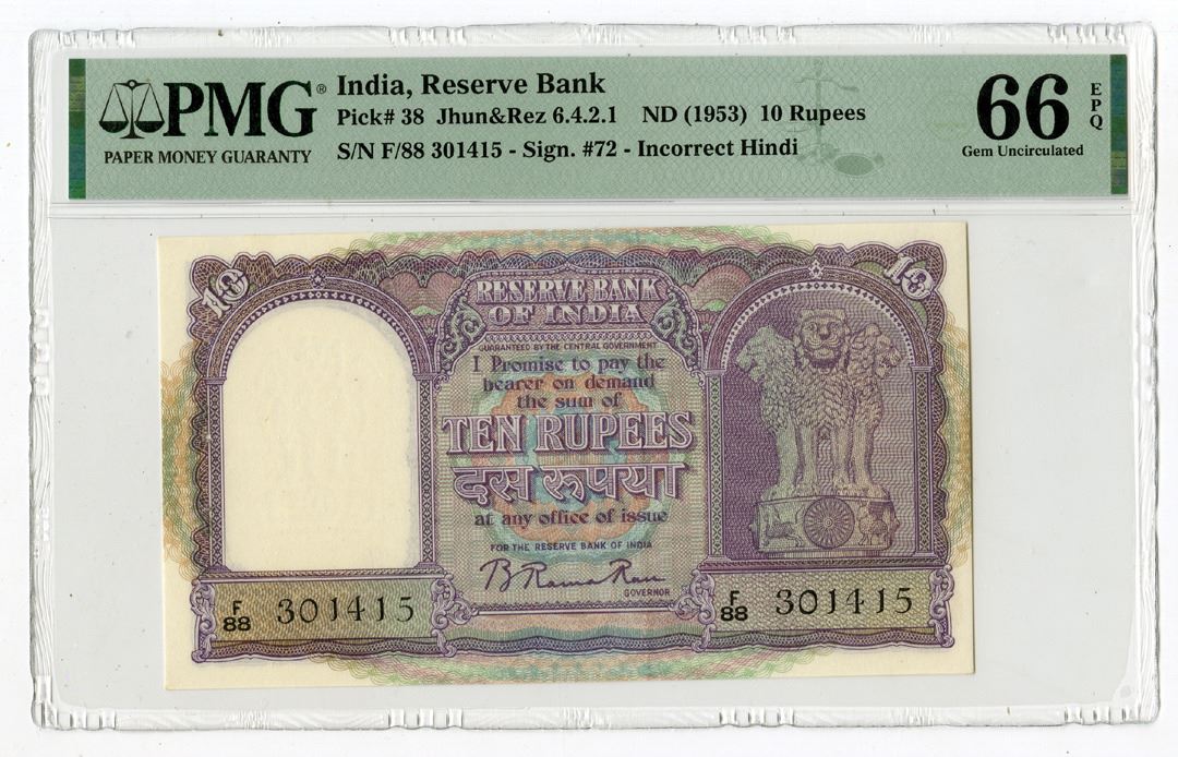 India, ND (1953). 10 Rupees, P-38 Jhun&Rez 6.4.2.1, Issued Banknote, Purple on m/c underprint with Asoka column at right, Back is purple on m/c underprint, S/N F/88 301415, PMG graded Gem Uncirculated 66 EPQ with comment "Staple Holes at Issue." Only 6 notes grade higher out of 315 graded in the PMG census.