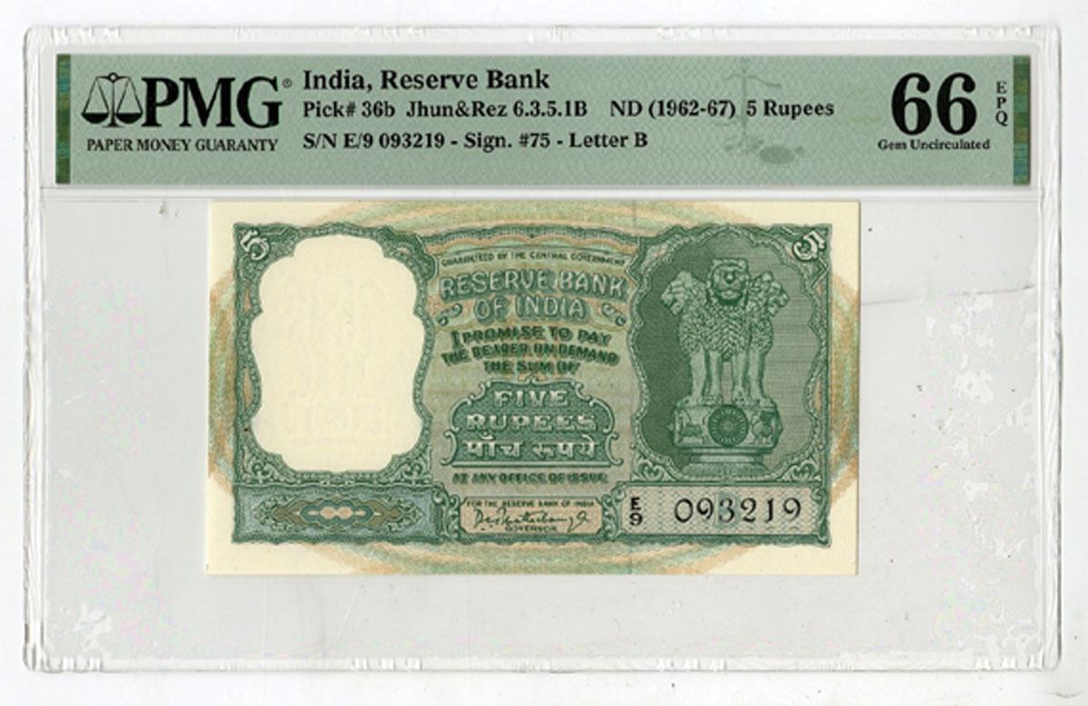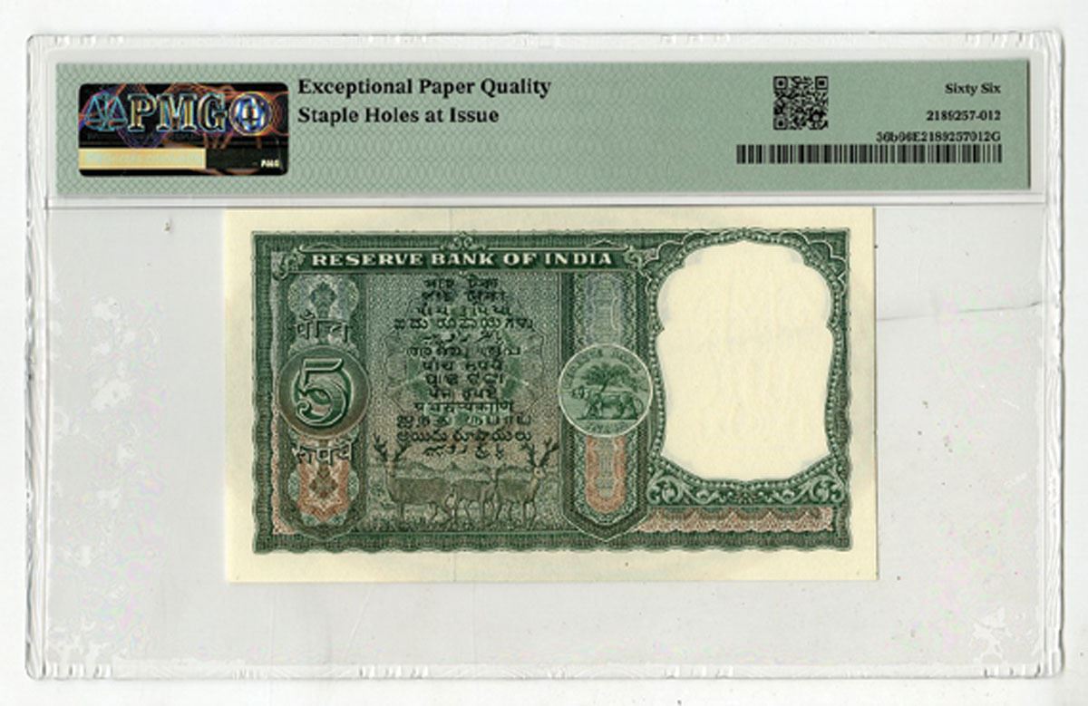 India, ND (1962-67). 5 Rupees, P-36b Jhun&Rez 6.3.5.1B, Issued Banknote, Green on m/c underprint with Asoka columns at right, S/N E/9 093219, PMG graded Gem Uncirculated 66 EPQ with comment "Staple Holes at Issue." This is the highest graded example to be offered at auction in the last 10 years.
