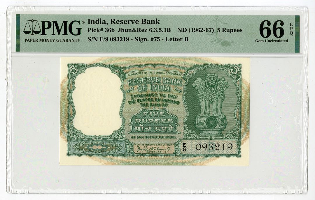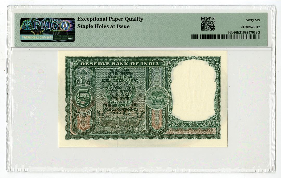 India, ND (1962-67). 5 Rupees, P-36b Jhun&Rez 6.3.5.1B, Issued Banknote, Green on m/c underprint, Corrected Hindi, Asoka column at right, Back is dark green on m/c underprint with deer at center, S/N E/9 093219, PMG graded Gem Uncirculated 66 EPQ with comment "Staple Holes at Issue." This is tied with one other note, also offered in this auction, as highest graded and the only Gem Uncirculated notes out of 99 graded in the PMG census.