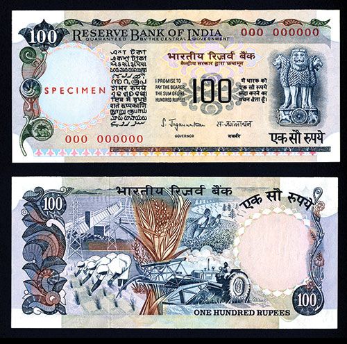 India, ND (1975), 100 Rupees, P-85a, Unlisted Specimen banknote, Black and blue-violet on brown with tan center on m/c, Asoka column on right, S. Jaganathan Signature 78 without underprint letter, Red SPECIMEN overprint over Asoka column watermark at left, Red S/N 000 000000, Choice Uncirculated.