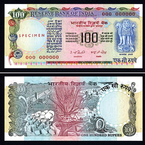 India, ND (1979), 100 Rupees, P-86a, Unlisted Specimen banknote, Black, deep red and purple on m/c, Asoka column on right, I.G. Patel Signature 82 without underprint letter, Red SPECIMEN overprint over Asoka column watermark at left, Red S/N 000 000000, Appears Choice Uncirculated but there are 5 small pin holes on the top left margin and 2 small pin holes on the lower left and also evidence of a paper clip impression on the upper left margin, still and amazing note that will be difficult to improve upon and is very rare in any condition.
