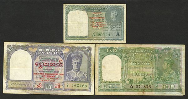 Burma, Lot of 3 notes, Includes 10 Rupees, P-5 and P-28 and 1 Rupee, P-25, all in Fine to VF condition.