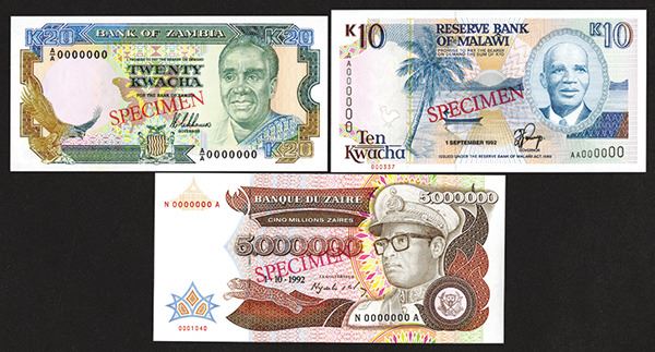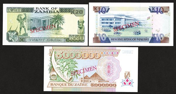 Malawi. 10 Kwacha. 1992. P-25s. #000337 in lower margin; 5,000,000 Zaires, 1992, P-46s. #0001040 in lower margin; Zambia. 20 Kwacha. P-32s. Signature 8. Serial # prefix A/A. All Very Choice to Gem Uncirculated. 3 pieces.