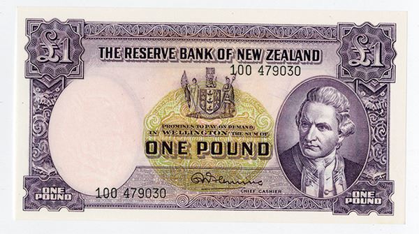 New Zealand, 1 Pound, P-159c, Issued banknote, Wellington at right, Signed by Fleming as cashier, Choice to Gem Uncirculated, scarcer variety without serial number.