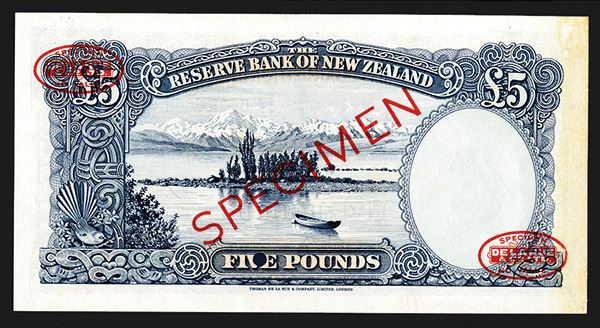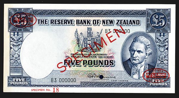New Zealand. Captain Cook at right. Pick #160s (160c for type). Unlisted as a Specimen. DeLaRue oval stamps in corners, number in lower left, punch hole cancel on signature. Back right edge with paper tone from former mounting. PMG graded Choice Uncirculated 63 NET.