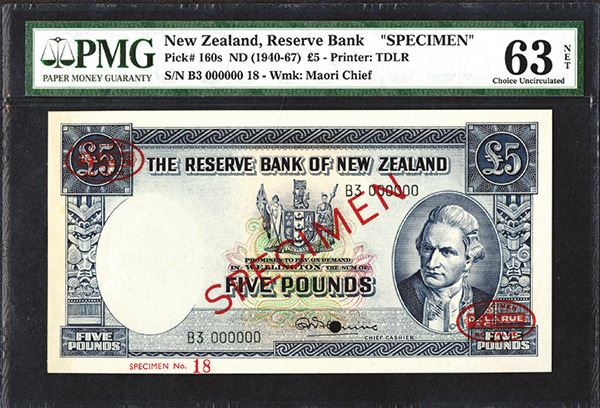 New Zealand. Captain Cook at right. Pick #160s (160c for type). Unlisted as a Specimen. DeLaRue oval stamps in corners, number in lower left, punch hole cancel on signature. Back right edge with paper tone from former mounting. PMG graded Choice Uncirculated 63 NET.